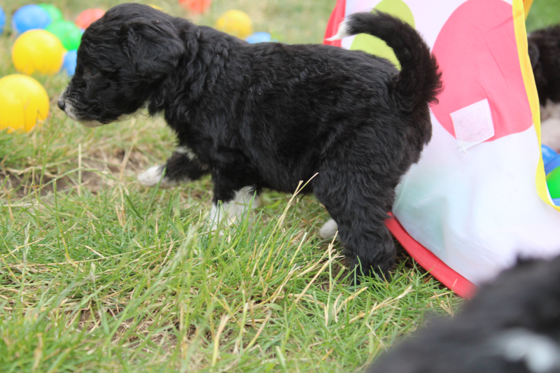 4-7 Djess is vandaag 4 weken oud. Ze is een echte onderzoeker en is zowel prima op zichzelf als dat ze graag met andere pups speelt. Mensen vindt ze ook interessant. Ze is rustig en ontspannen en houdt van speelse bewegingen maken. Djess heeft een golvende vacht maar is toch anders dan de andere pups. De meesten hebben een extra zachte vacht daaronder en dat heeft Djess niet