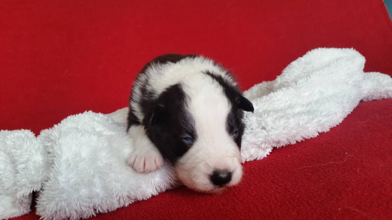 8 weken oud. Ze ontwikkelt goed. Ze luistert goed naar haar naam en leert snel. Ook enge dingen pakt ze heel goed op. Ze schrikt niet snel en probeert het beste uit alles te halen. Botjes vindt ze heerlijk om op te knagen. Ze is slim want ze heeft het botje in haar bek. Zodra iemand het botje af wil pakken draait ze zich om zodat de ander om haar heen moet rennen om het botje af te pakken. Maar dit wint ze bijna altijd. Tenzij de ander het botje pakt voordat ze weg kan draaien