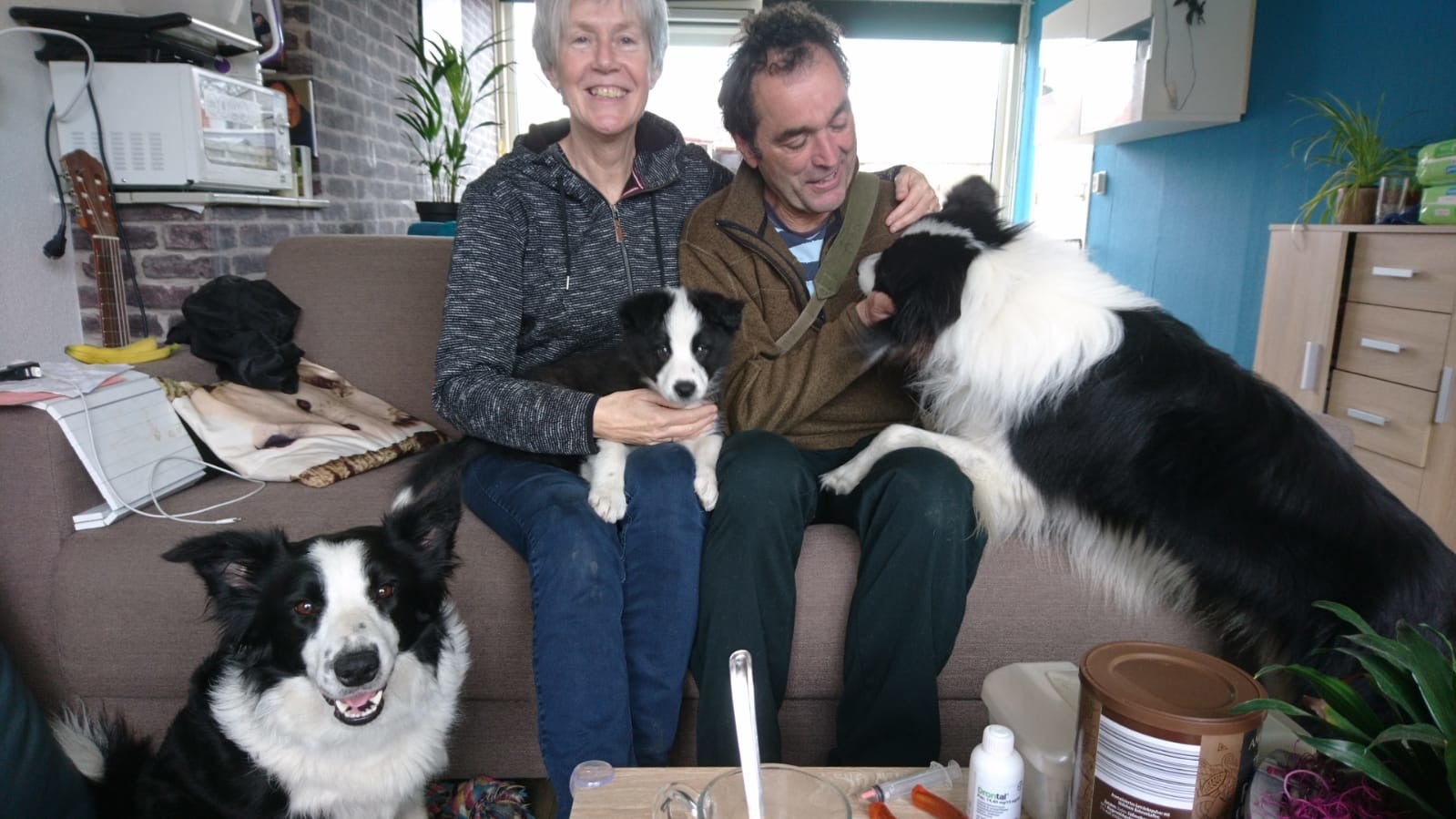 Bij haar nieuwe thuis bij vader Jake: vindt alles dat beweegt leuk om achteraan te gaan. Ze was nog niet helemaal zindelijk omdat het voor mij ook het eerste nestje was en nog moest ontdekken. Ze heeft in het begin al netjes in de tuin en in het bos haar behoeften gedaan. Ze heeft zelfs los gelopen en luistert zo goed naar haar naam. Dat is echt heel fijn. Haar bakje leeg eten deed ze niet gelijk want ze was te druk met spelen. En dat ondanks dat zij echt de grootste eter was onder de dames en in het begin zelfs meer dan de mannen. Maar toen ze net verhuisd was had ze ook erg interesse in het voer van haar vader. Concurrentie werkt vaak goed om de hond aan het eten te krijgen. Na een halve week begonnen Jake en Tess samen te gaan slapen.