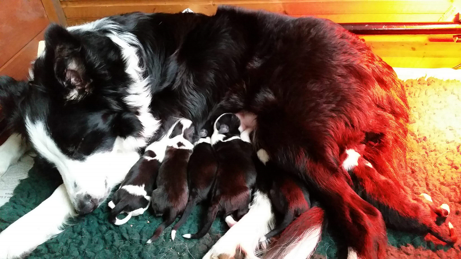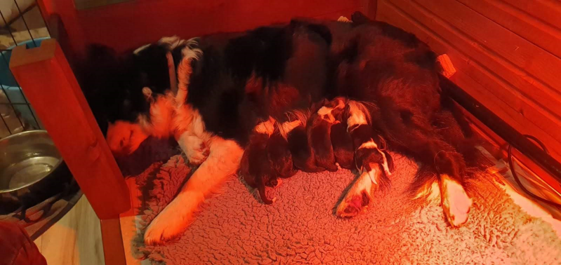Wat was het een bijzonder moment voor mij. Na zo lang dromen lag hier mijn eerste Border collie nestje. Zo ontzettend bijzonder en zoveel liefde dat je gelijk voor ze allemaal hebt. Ik heb uren voor de werpkist gelegen om te genieten van dit prachtige stel. Ze hadden ook geen bandjes nodig want ze waren goed uit elkaar te houden. Gelukkig maar want dan kunnen ze ook nergens achter blijven hangen enz.