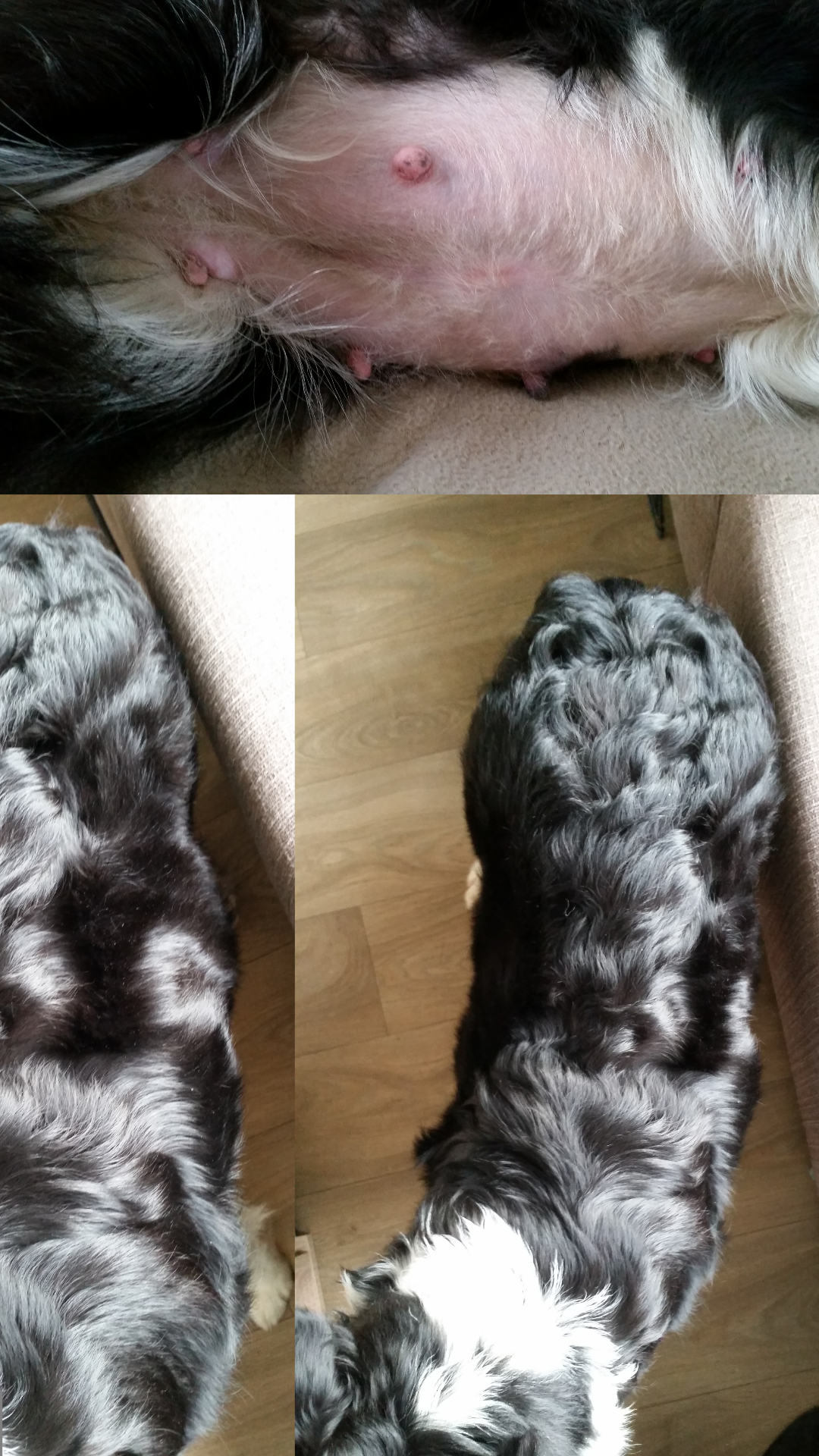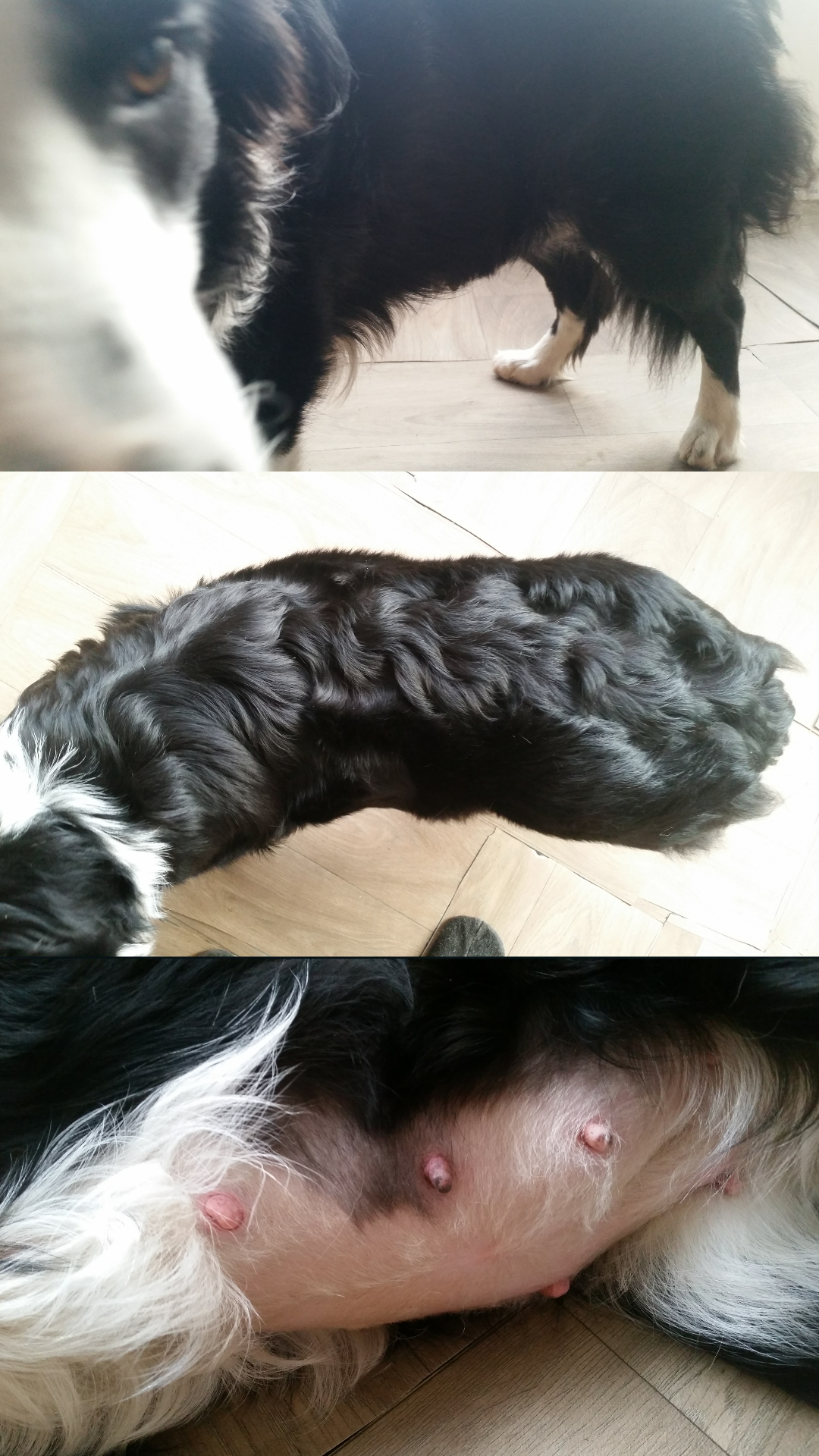 3 januari met regendruppels op haar vacht is hier haar dikkere buik te zien. Mayla kan sinds eergister niet echt lekker meer liggen. Die buik zit in de weg en dan strekt ze ineens een poot of draait ze zich om
