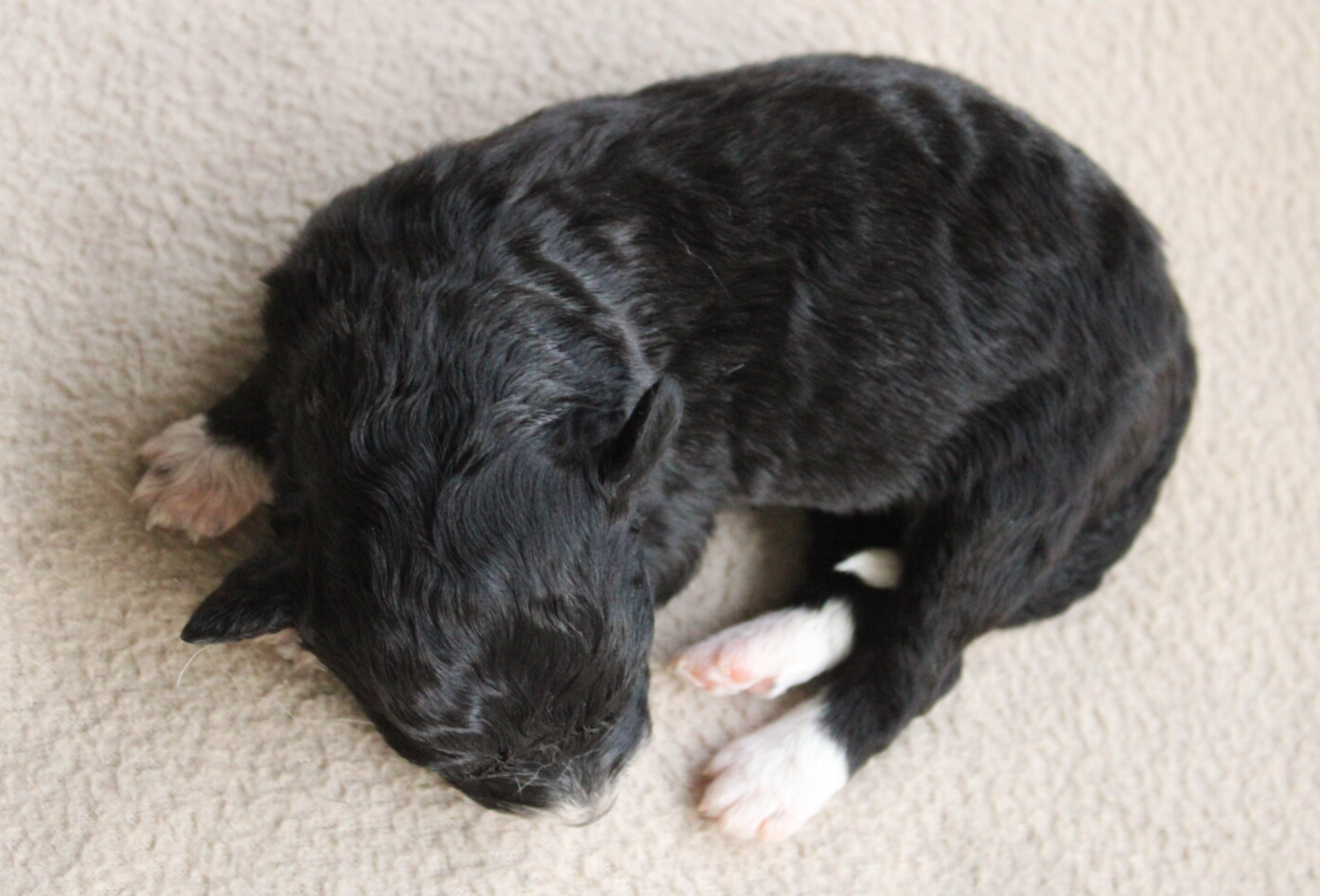 4-7 Djess is vandaag 4 weken oud. Ze is een echte onderzoeker en is zowel prima op zichzelf als dat ze graag met andere pups speelt. Mensen vindt ze ook interessant. Ze is rustig en ontspannen en houdt van speelse bewegingen maken. Djess heeft een golvende vacht maar is toch anders dan de andere pups. De meesten hebben een extra zachte vacht daaronder en dat heeft Djess niet