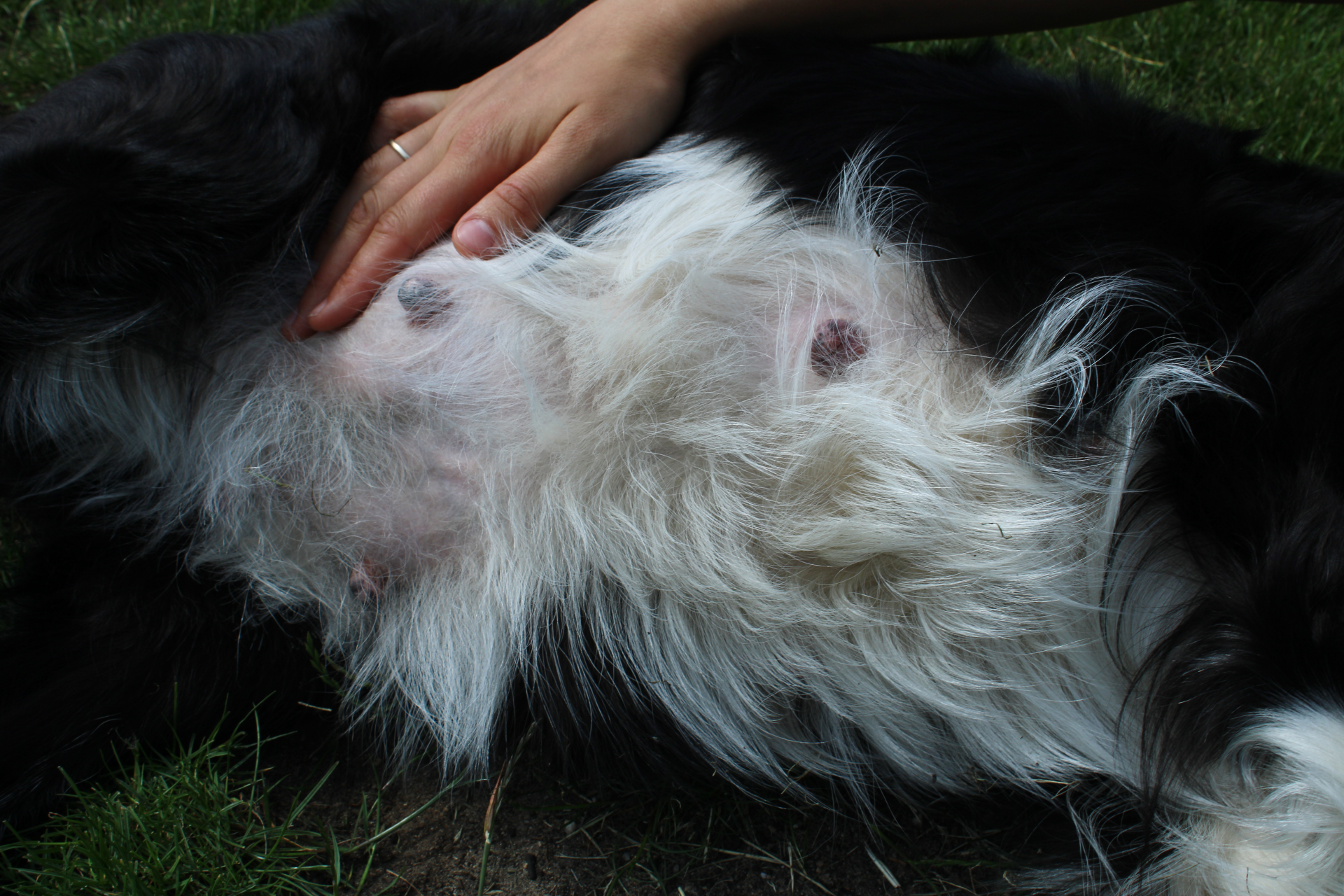 14 mei is de eerste pup gevoeld! Het is heel moeilijk om te voelen of het nu een pup is of Mayla zelf. Ze begint al een lekker buikje te krijgen en die laat ze graag zien op de foto hiernaast. Ze heeft echt weinig conditie. In het warme weer houdt ze zich rustig dus is het goed te doen