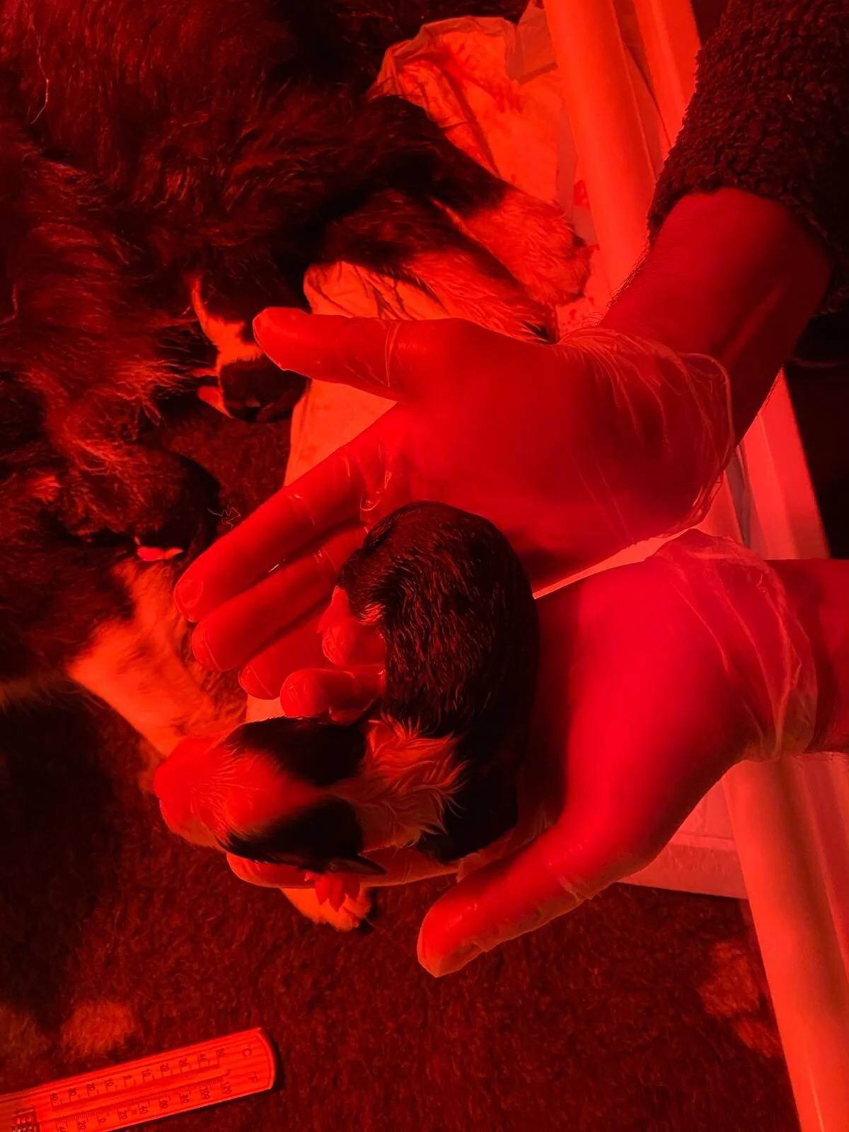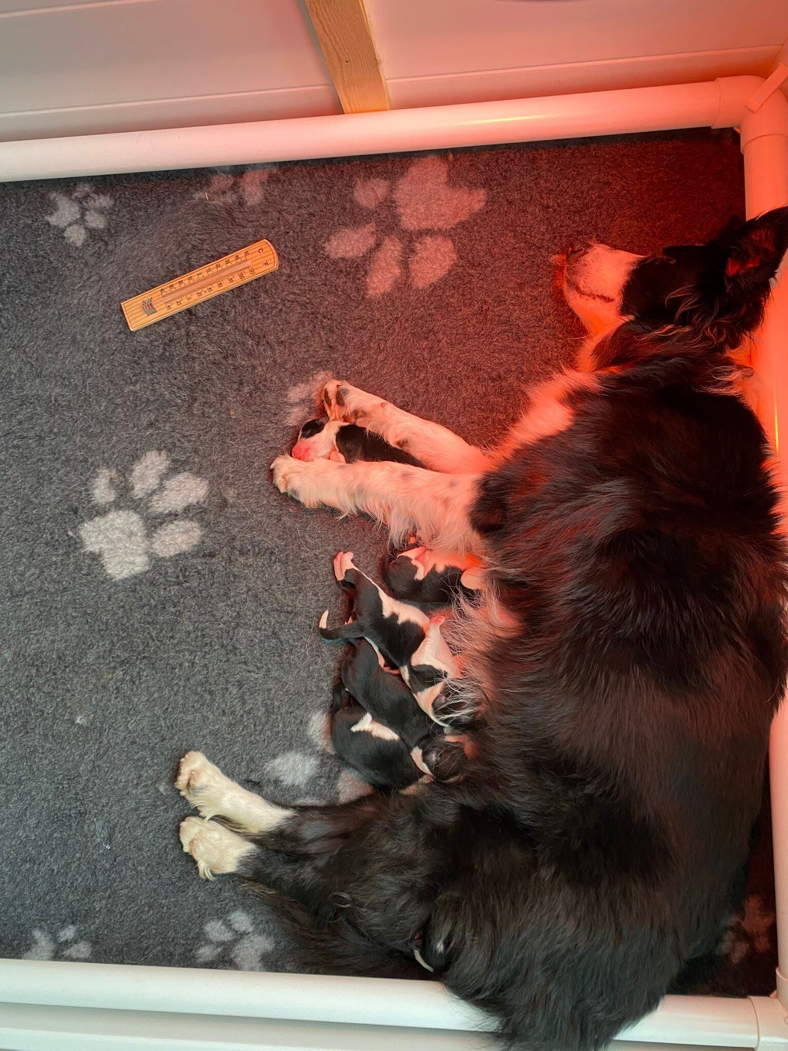 Het was een lange nacht. Lang wachten tot eindelijk de persweeën kwamen. Van halverwege de nacht tot begin de ochtend heeft Tess even 6 pups op de wereld gezet. Gelukkig was het een goeie bevalling en maken alle pups het goed. Tess is een trotse moeder