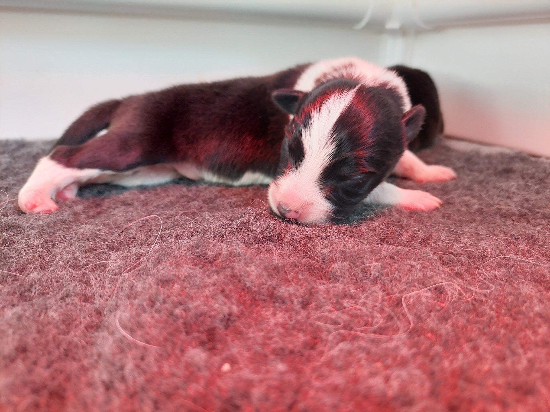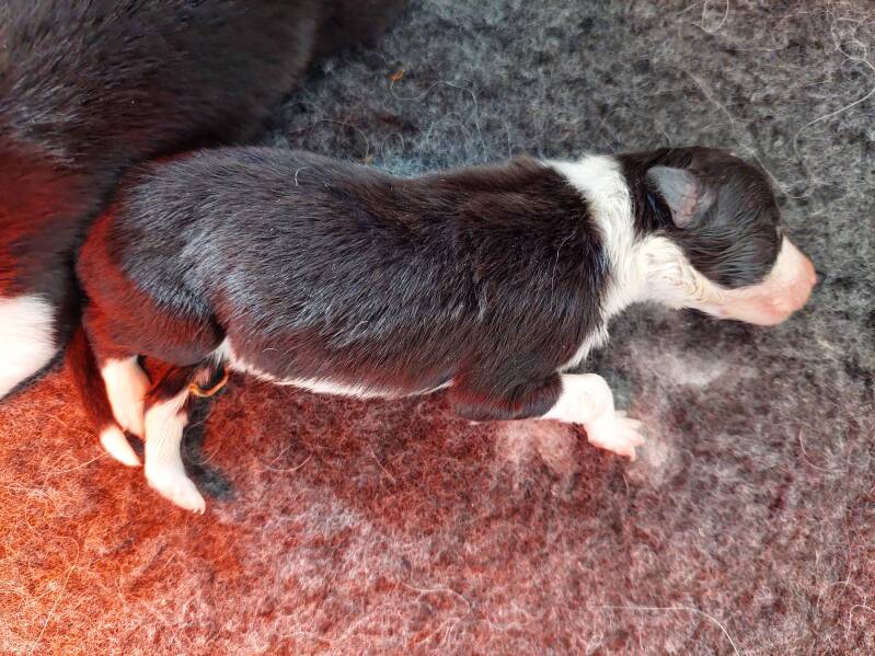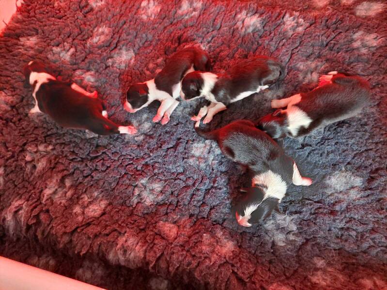 6-5: De pups doen goed hun best met drinken maar helaas zijn ze afgevallen. Ze moeten morgen aankomen, anders moet ik nog een keer de dierenarts bellen. Helaas is Finley halverwege de ochtend overleden! Ik wilde hem aanleggen en hij voelde stijf. Hij was wat kouder geworden en lag in een gekke houding. Hij had een groene kleur op zich wat te maken heeft met de placenta. Waarschijnlijk had hij in de baarmoeder al wat. Dan overlijden de pups binnen 2 dagen.