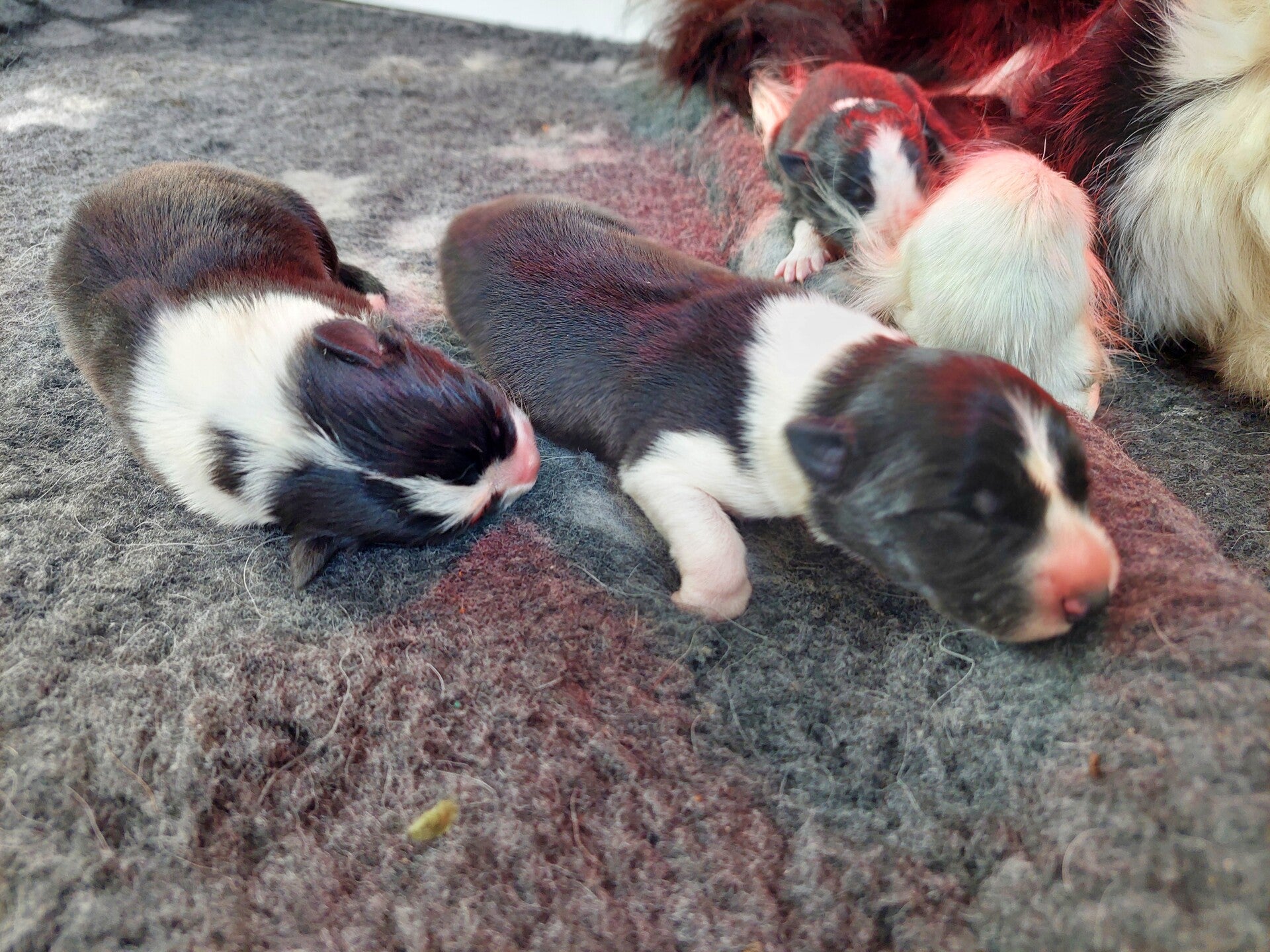 Een keer piepte er een pup maar verder was het allemaal rustig. Het is fijn dat Mayla al ervaring heeft want ze ging meteen aan het werk. Ze is wel moe en zoekt momenten om te rusten. De pups laten duidelijk horen als ze wat nodig hebben en meteen schiet Mayla te hulp. Zelfs als een pup hulp nodig heeft laat ze de anderen even liggen en helpt ze die pup.