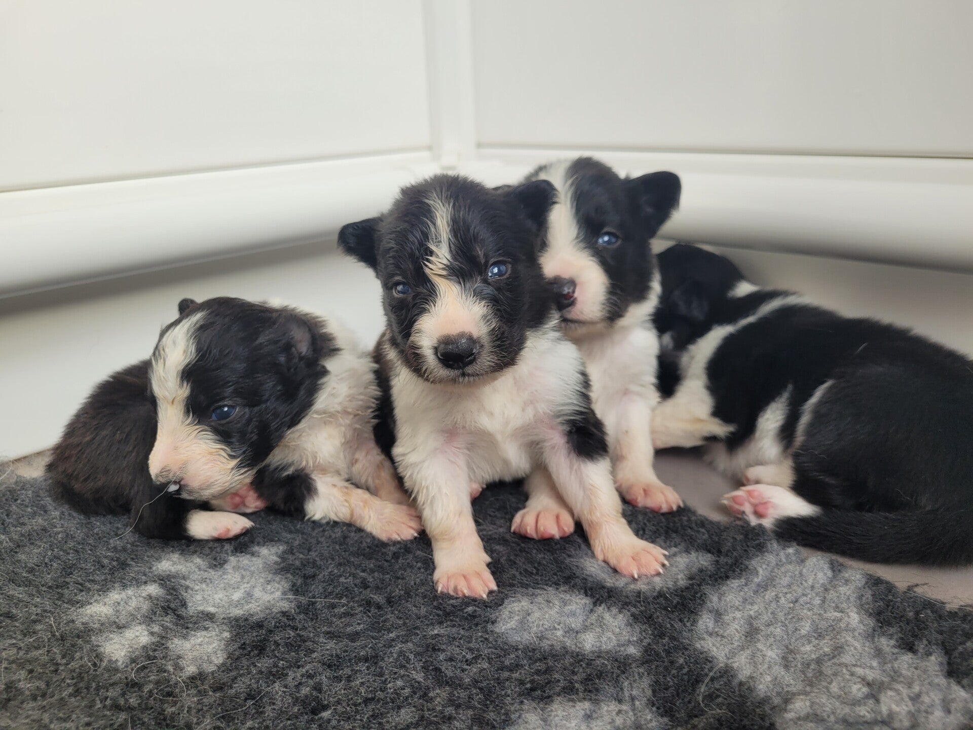 16-5: De eerste oogjes zijn gespot! Het rechter oog van Flash is al goed te zien, het linker oog ook en Fellow zijn rechteroog. Er zal nu steeds meer karakter komen. Ook zijn ze nu een dag of 3 echt aan het lopen. Het gaat heel wiebelig en is even op de pootjes en dan zakken ze weer erdoor. Alle 4 lopen ze
