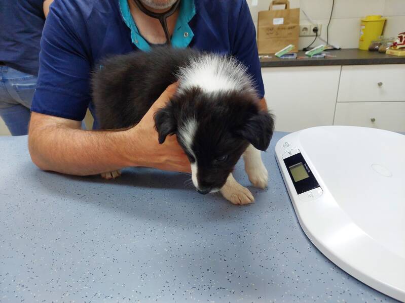 Bij de dierenarts hebben ze netjes gewacht. Eerst wilden vooral de jongens het liefst de deur uit rennen en Finya ging blaffen naar andere honden. Het was ook allemaal spannend. Probleemloos gingen ze op de grote weegschaal een voor een staan om te wegen. Dus heel netjes. Finya woog 3,15 kg, Flynn 4,2 kg en Flame 4 kg. In de behandelkamer waren het echte stuiterballen. Het was even oppassen want we zaten in de ruimte van de echo dus overal waren snoeren. Dat was voor Flynn en een echte uitdaging. Finya als eerste op de behandeltafel vond het erg lastig want die wilde achter haar broers aan.