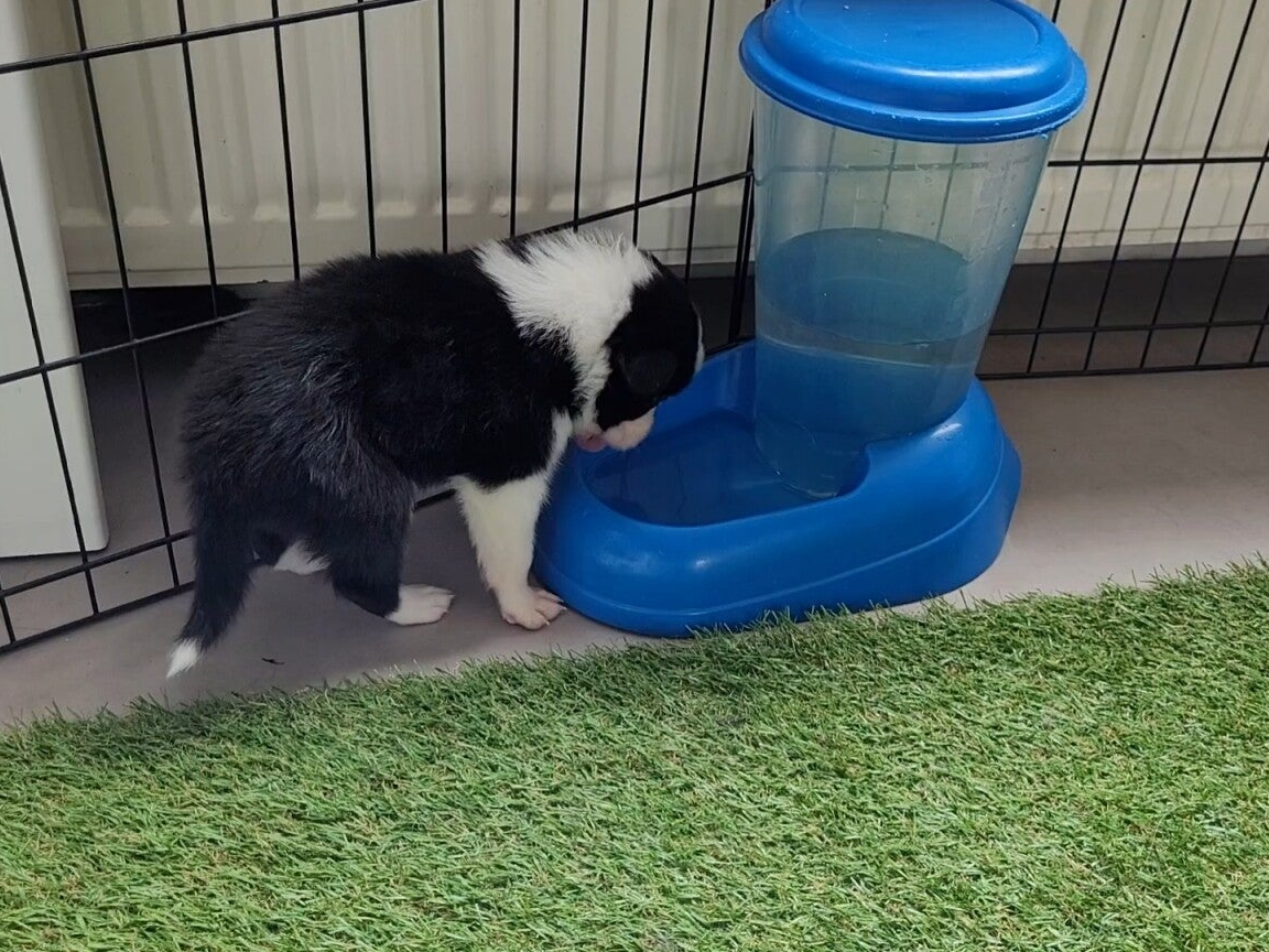 30-5: de drinkbak is nu in de ren. De pups vinden het vooral interessant en namen soms een slokje. Een dag later deed Flash ineens zijn poot express erin om te zien wat er gebeurde