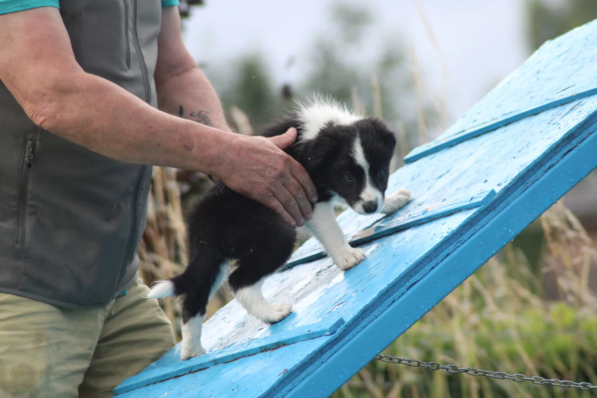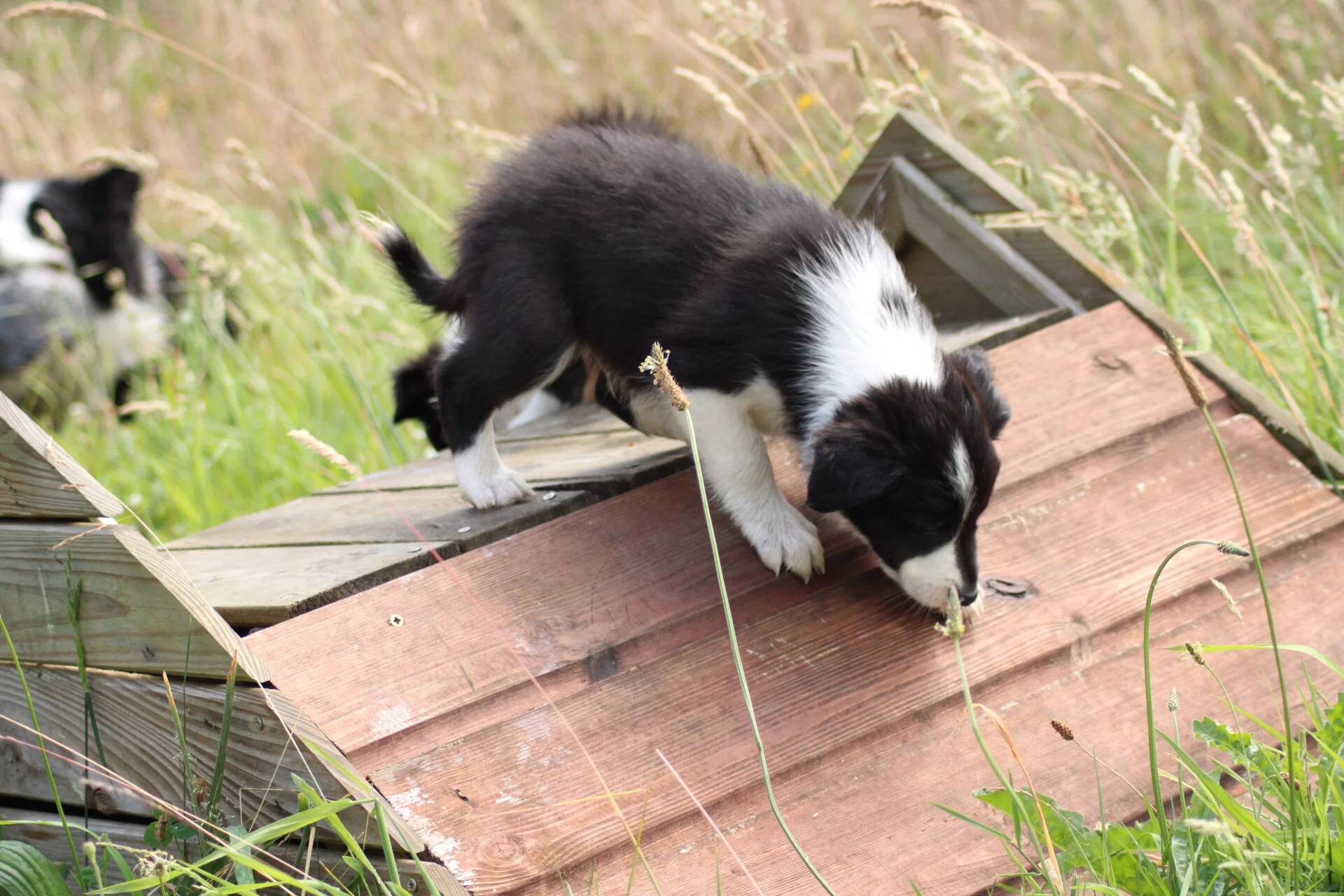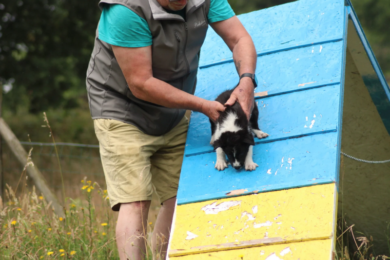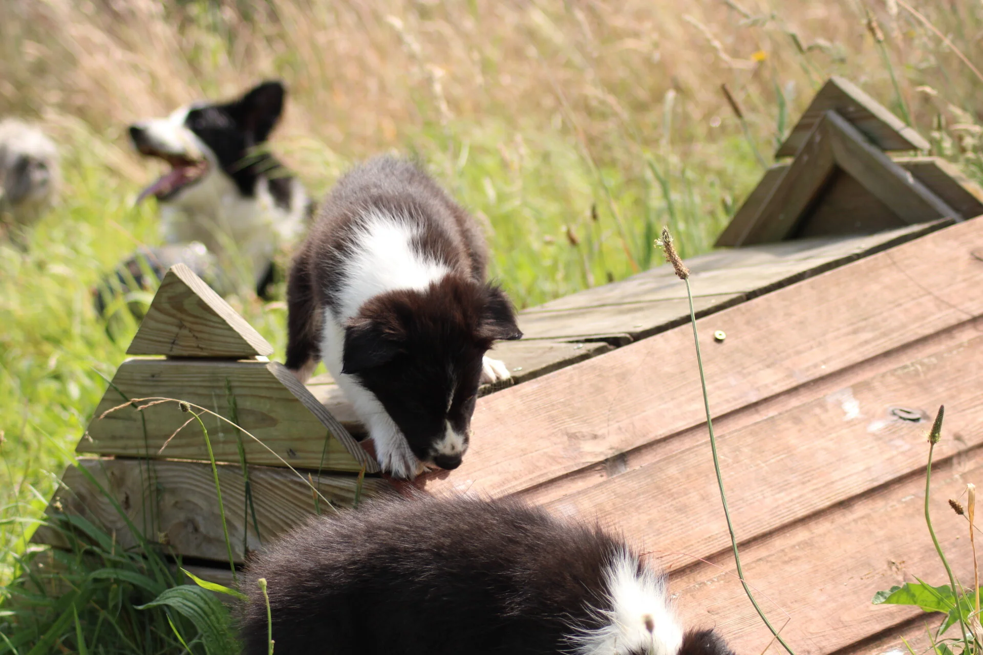 23-6: Op het veld staan verschillende agility toestellen. Zo mooi om te zien dat ze op deze leeftijd nog niet snel bang zijn. Ze zijn zo nieuwsgierig en willen alles proberen. Ze zijn ook nog op de wip geweest. Sommige deden het uit zichzelf. Waar de wip ineens naar beneden gaat vinden veel pups/honden eng maar alle 4 hadden er geen probleem mee.